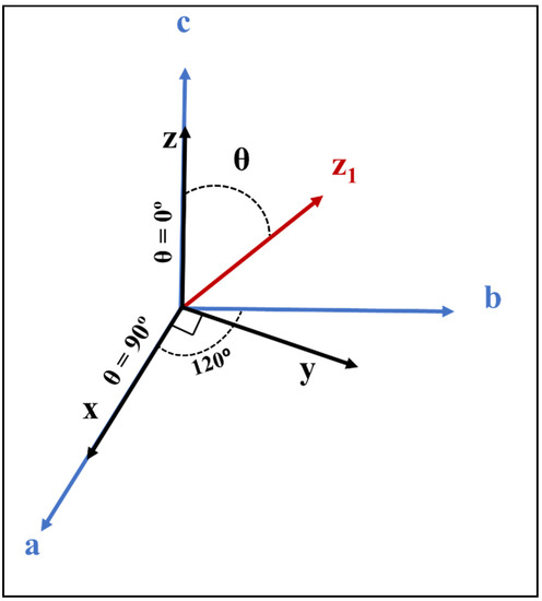 The hexagonal unit cell a, b, and c-axes, the orthogonal x, y, and z-axes, and the vector (z1) and its direction (θ) with respect to the z-axis (c-axis). θ = 0° when z1 is parallel to the z-axis (c-axis), and θ = 90° when z1 is perpendicular to the z-axis (c-axis).