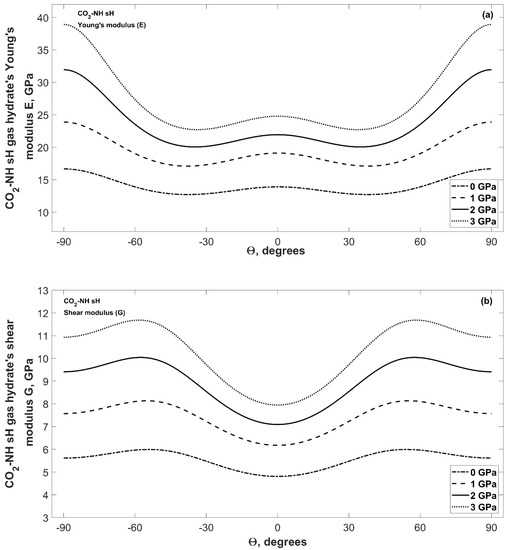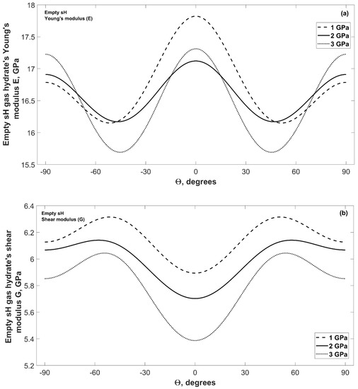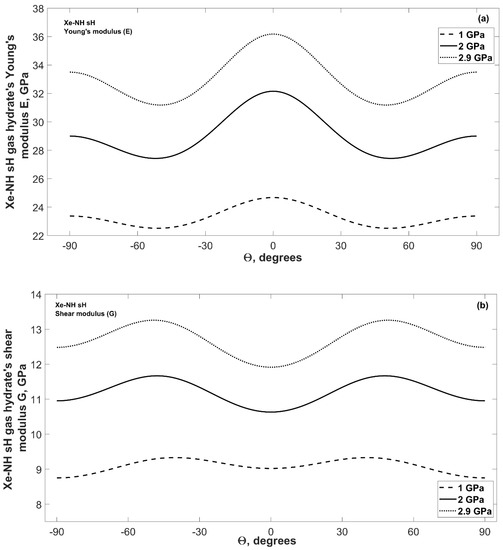 To characterize the variation of Young’s and shear moduli of sH gas hydrates with direction, the moduli versus the angle θ of empty, Xe-NH, and CO2-NH sH gas hydrates are presented in Figure 7, Figure 8, and Figure 9, respectively. The trends of the direction dependent moduli are the same for the same hydrate structure at different pressures. Figure 7, Figure 8 and Figure 9 clearly show the cylindrical symmetry of sH gas hydrates’ Young’s and shear moduli with respect to the z-axis (c-axis, [0001]) of the hexagonal unit cell of sH gas hydrate.