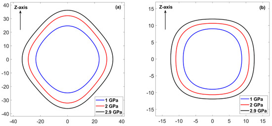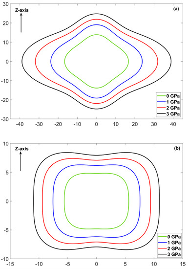 To better characterize the anisotropy in Young’s and shear moduli of sH gas hydrates under pressure, the projections of the moduli on polar plots are used where the y-axis of the plot is the vector parallel to the z-axis (c-axis) and the x-axis of the plot is the vector perpendicular to the z-axis (c-axis) of the sH gas hydrate’s unit cell. Isotropic materials have a plot of circular shape and the deviation from this constant curvature shape reflects the material’s moduli anisotropy [42]. Figure 10 shows the Young’s (a) and shear (b) moduli projections or polar plots of empty sH gas hydrate. The empty structure experiences a distorted circular symmetry of both moduli at all pressures. However, the deviation from the circular shape is more pronounced for the Young’s modulus (Figure 10a). The shear modulus of empty sH gas hydrate in polar coordinates slightly deviates from the circular shape reflecting the small shear moduli anisotropy that marginally increases with pressure (Figure 10b). The higher anisotropic characteristics of Young’s modulus compared to shear modulus anisotropy of empty sH gas hydrate agrees with the findings for hexagonal ice (Ih) [38]. Franco Pinheiro Moreira et al. [38] evaluated the Young’s and shear moduli of ice (Ih) using molecular dynamics and different water models at zero temperature and zero pressure. They also discussed the impact of chosen water model on elastic anisotropy. Their results show that angular Young’s modulus of ice (Ih) deviates from the circular shape more than its shear modulus does. Notably this particular behavior of ice (Ih) moduli [38] is equivalent to that of the hexagonal empty sH gas hydrate of this work, highlighting the impact of symmetry.