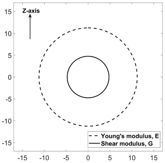 where E is the angular Young’s modulus, G is the angular shear modulus, Sαβ values represent the elastic compliances, and θ is the angle between the z-axis and a normal vector (z1) to a plane that intercepts the x, y, and z-axes. The basal plane of hexagonal crystals is isotropic, and the crystal’s anisotropy is studied by the orientation with respect to the z-axis (c-axis) represented by the angle θ [38]. The z-axis of a hexagonal crystal has the highest six-fold rotation symmetry, and hence compliances of the oriented structure depend only on θ [60]. This was discussed by Panda and Ravi Chandran [43] who explained that the in-plane anisotropy of a hexagonal TiB2 is not observed in XY plane, however, in-plane anisotropy is pronounced in YZ plane.