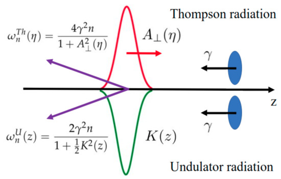 where is the solid angle, is the unit vector pointing from origin to the observation point, is the vector part of electron 4-velocity and 3-coordinate, respectively. Considering this equation as the Fourier transform in retarded time, one may use Fast Fourier Transform to efficiently calculate it [16]. Theoretical classical estimates of backscattered spectrum for symmetric laser pulse shapes can be found in [16]. From Equation (2), the Thomson and undulator emitted harmonic frequencies can be found and are given by