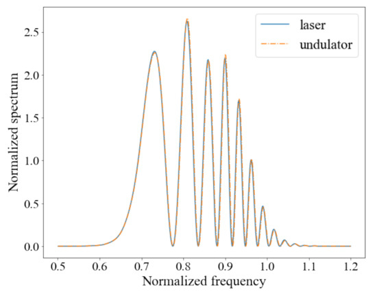 Backscattered spectrum from one electron () off a laser pulse with a triangular envelope and spectrum from one electron moving in a tapered undulator. Frequency is normalized by for laser pulse case and by for undulator case. Laser pulse parameters: . The emitted spectra coincide up to the frequency scaling factor.