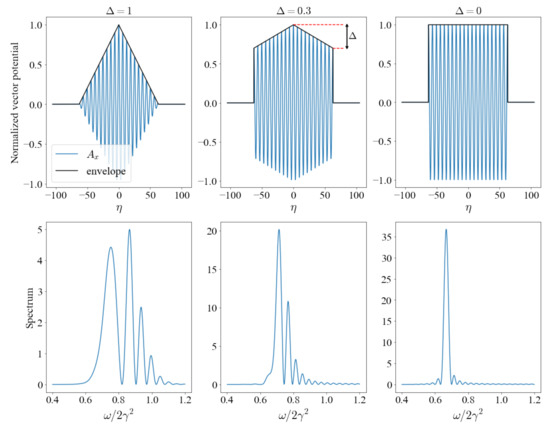 In Figure 3, the normalized vector potentials and corresponding backscattered spectra from one electron off a laser pulse with an undulator temporal envelope for various tapering rates () are shown. The field intensity () is, on the one hand, large enough for the interference pattern from ponderomotive broadening to be distinctly seen and, on the other hand, small enough so the harmonics do not overlap with each other. As it was already mentioned, the main emission line for typical undulators resides in the keV range; therefore, the spectrum could be resolved in detail by modern detectors and one could measure this band-like structure in the experiment. We are interested in the band-like interference pattern, which is broader with larger (Figure 3). Typical tapered undulators for FEL applications have relatively low tapering rates around 1–5% or less [18,19], for which the interference pattern is quite small, while for our purposes, strongly tapered undulators are needed. Therefore, we make scan simulations with a triangle envelope for different laser pulse and electron beam parameters, and then for a selected set of parameters several tapering rates are modeled.