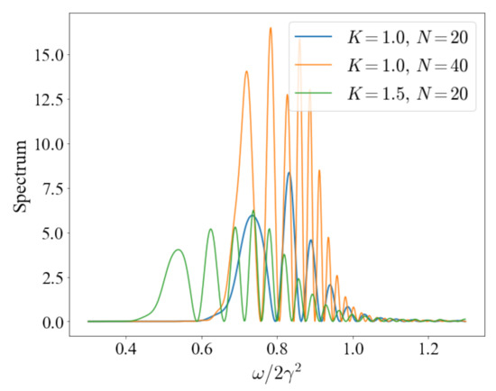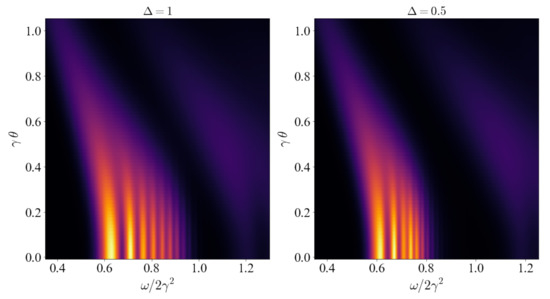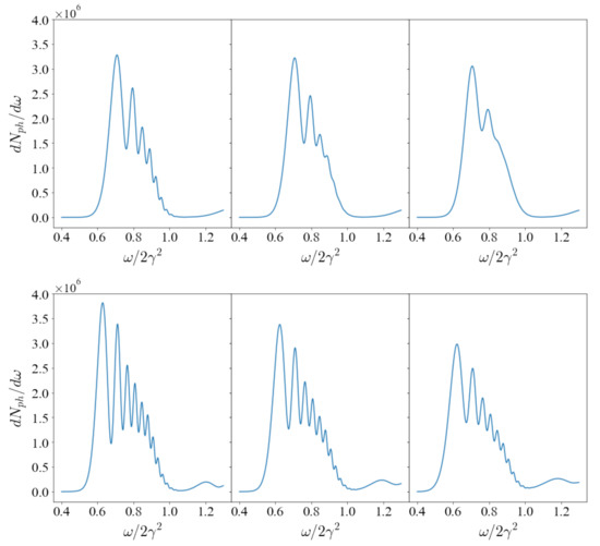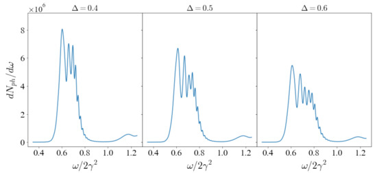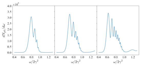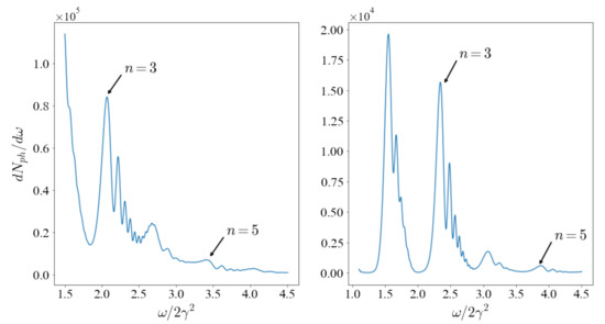 From Equation (3) we could see that on the axis the main emission line is broadened from up to . In other words, for larger K the nonlinearity effects are stronger, leading to a broader main emission line and broader harmonics. For large K harmonics may start to overlap due to both ponderomotive broadening and non-ideal electron beam effects. Figure 7 represents results for fixed angular and energy divergence () and increasing laser strength . The interference pattern is visible for all cases, and there are more sub-peaks for stronger pulses. The same band-like structure could be observed in harmonics as well; for instance, Figure 8 shows the differential number of photons in the harmonics region for a triangle envelope for two cases: (1) , (2) . For the first case due to a relatively large collimation angle and non-ideal beam effects, even off-axis harmonics overlap with odd on-axis ones, which spoils the overall picture. Still, we can consider more ideal electron beam parameters and a smaller collimation angle to make the interference pattern more visible.