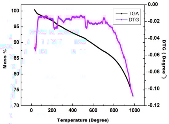 A thermal analyzer, the Nietzsche 449 Jupiter design (Weimar, Döbereiner, Germany) has been used to acquire simultaneous thermogravimetry–derivative thermogravimetry (TG—DTG) measurements. The investigations were performed under a nitrogen gas atmosphere in a temperature range of 25–1000 °C at a gas flow rate of 40 mL min−1. The rate of heating of the test sample was 10 °C min−1.