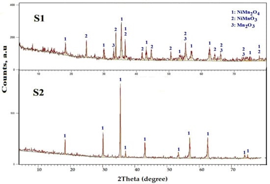 The identification and distinction between the crystalline lattices in the as synthesized solids carried out using the XRD analysis. XRD patterns of the S1 and S2 samples calcined at 700 °C for 2 h were illustrated in Figure 2, respectively. Examining this figure led to the following results: (i) the existence of NiMn2O4, NiMnO3 and Mn2O3 phases are registered in the XRD pattern of the S1 sample.