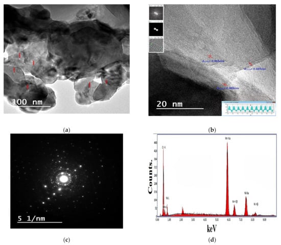 Thus, the authors confirm that the glycine treatment followed by heating at 700 °C of Ni-Mn mixed oxides brought about changes in related structural properties namely, the crystallite size (d), lattice constant (a), X-ray density (Dx), distance between the reacting ions (LA and LB), ionic radii (rA, rB) and bond lengths (A–O and B–O) on tetrahedral (A) sites and octahedral (B) sites of NiMn2O4 spinel as shown in Table 3 [,,]. These findings could be attributed to the enhancement effect of glycine in formation nanosized particles depending upon redistribution of reacting cations and liberation of different gases during the preparation process.