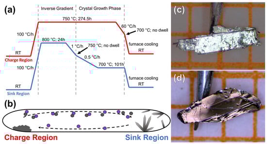 The ampule was carefully placed in a two-zone tube furnace in such a way that the reaction mixture was only at one side of the ampule which is referred to as the charge region. As illustrated in Figure 2a, the furnace was initially heated homogeneously to 750 C at 100 C/h. The charge region was kept at this temperature for 274.5 h while the other side of the ampule, which is the sink region (see Figure 2b), was initially heated up to 800 C at 100 C/h, dwelled at this temperature for 24 h and then cooled back to 750 C at 1 C/h. An inverse transport gradient is formed, i.e., transport from sink to charge, to clean the sink region of particles which stuck to the walls of the quartz ampule during the previous preparation steps. This ensures improved nucleation conditions in the following step. Then the sink region was cooled to 690 C at 0.5 C/h to gradually form the thermal transport gradient resulting in a controlled nucleation. With a final gradient of 750 C (charge) to 690 C (sink), the ampule was dwelled for 100 h. After this period of time, the charge region was cooled to the sink temperature in 1 h before both regions were furnace cooled (i.e., the heating elements were turned off) to room temperature.