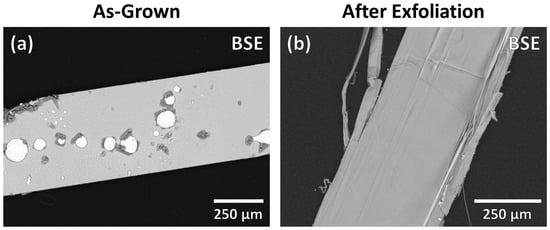 As shown in Figure 3a, some as-grown crystals exhibit small spherical particles (likely solidified droplets) of a secondary phase (bright) and pieces of a second secondary phase (dark). As the secondary phases are found only on the surface, exfoliating the crystals is sufficient to remove the secondary phases and results in crystals with clean surfaces, as illustrated in Figure 3b.