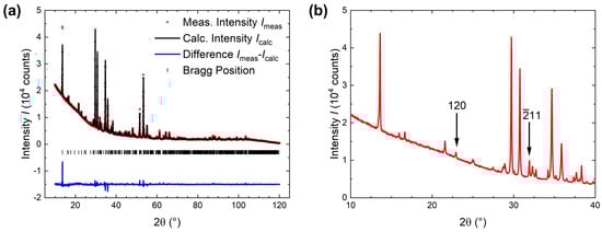 The crystal structure of the obtained crystals was investigated by powder X-ray diffraction (pXRD), which was measured on a STOE STADI laboratory diffractometer in transmission geometry with Cu-K radiation from a curved Ge(111) single crystal monochromator and detected by a MYTHEN 1K 12.5-linear position sensitive detector manufactured by DECTRIS. The pXRD patterns were initially analyzed by pattern matching using the HighScore Plus program suite [25]. After the crystallographic phase was identified, a structural refinement of the crystal structure model was performed based on our experimental patterns using the Rietveld method in Jana2006 [26].