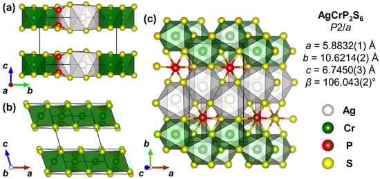 Refined crystal structure model of AgCrPS after Rietveld refinement. View along a in (a), along b in (b) and along in (c). The CrS and AgS coordination environments are shown in the color of the respective central atom.