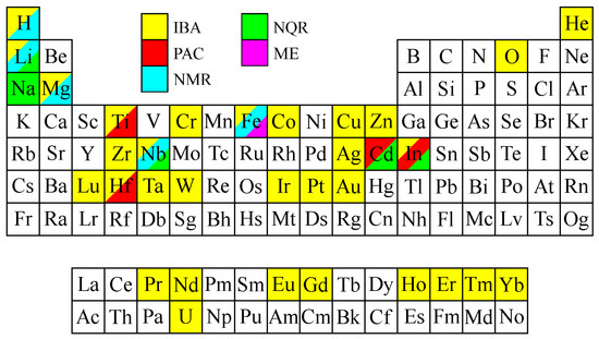 “Periodic table of elements” in LN for which one or several nuclear techniques have been applied in the investigation of their properties. IBA—Ion Beam Analysis, PAC—Perturbed Angular Correlation, NMR—Nuclear Magnetic Resonance, NQR—Nuclear Quadrupole Resonance, ME—Mössbauer Effect.