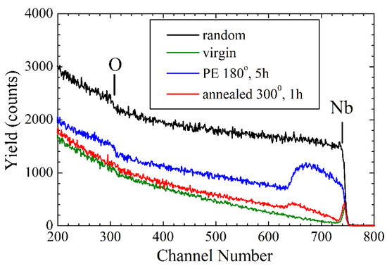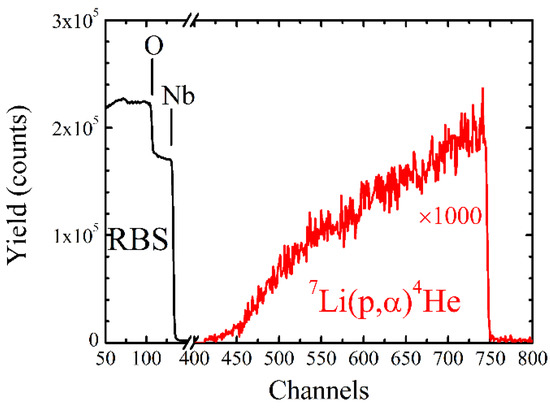 RBS relies on elastic backscattering of the incoming ions by the target atoms. Its origins can be traced back to the 1909 experiments performed by Geiger and Marsden [17] which led to the first modern model of the atom. The energy spectra of backscattered light ions (protons, He+ and He++) in the MeV range provide information on the composition of the material and its depth dependence up to several μm into the bulk. Since the backscattering yield is proportional to the square of the target atomic number, this method works best for targets composed of heavy elements. Therefore, lighter elements in heavy matrices are often difficult or only indirectly determinable while the method excels in the detection of small quantities of heavy elements in light targets. Further, the difference in the maximum backscattering energy decreases rapidly with increasing target atom mass making it difficult to discern elements that are neighbors in the periodic table. In order to overcome the restrictions for light elements, resonant elastic scattering, i.e., deviations from the Rutherford cross section, are employed to improve the sensitivity for their detection. This technique is known as Resonant Elastics Scattering or Elastic Backscattering Spectrometry (EBS). Analysis of RBS and RES spectra is done with dedicated software, e.g., RUMP [18] and NDF [19]. As an example, Figure 2 shows a backscattering spectrum for congruent LN irradiated with 3.1 MeV He+ demonstrating Nb-RBS and O-RES while Li remains invisible.
