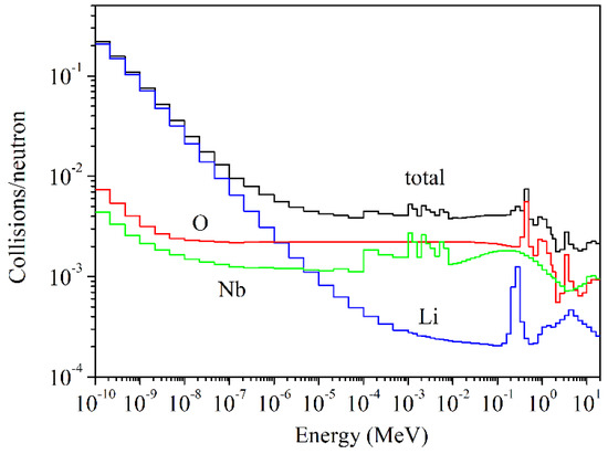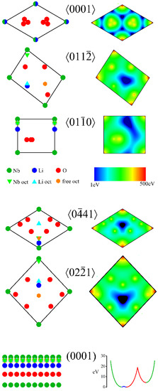 These results can be related to the lattice structure looking at the interaction potential in the (0001) plane seen by the incoming ions, shown in Figure 13, which was calculated using Molière’s approximation to the Thomas–Fermi potential under the assumption of a static lattice [68]. Two pronounced minima are visible, showing the existence of two channels for the incoming ions, separated by a potential barrier associated to O ions. One of those minima, designated as Li-I, corresponds to the regular Li position, whereas the other one, named as Li-II, lies close to a regular Nb location. It could be considered as a Li that substitutes for an Nb and then shifts towards the nearest oxygen plane up to a position symmetrical to that of Li. The existence of those defective Li sites is a key result that provides a confirmation of theoretical analyses [67] proposing the occurrence of inverted Li-Nb sequences as they appear in the related ilmenite structure.