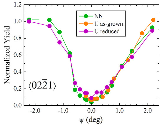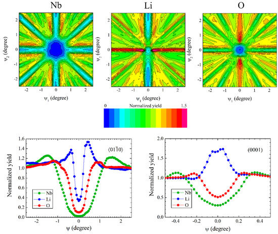 The evaluation of the effect of a dopant on a non-Nb site—regular or interstitial—by simple reasoning can lead to serious errors. Therefore, the use of simulation software is mandatory for the lattice site determination of intrinsic and extrinsic defects in LN. Results presented and discussed in this review are based on two channeling simulation programs. FLUX [22,23] is a long-known code for RBS/C and NRA/C in cubic crystals that has been adapted to the trigonal LN lattice. CASSIS [24,25,26,27] is a multi-purpose code, i.e., it is applicable for all Bravais lattices and can also deal realistically with PIXE/C and high dopant concentrations. Figure 7 shows results of CASSIS for two-dimensional RBS/C calculations for the y-axis.