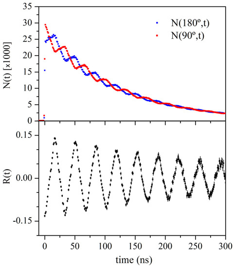Equation (1) is used to calculate the time differential anisotropy R(t) from the coincidence spectra N(θ,t), where θ is the angle between detectors and t is the time delay between events.