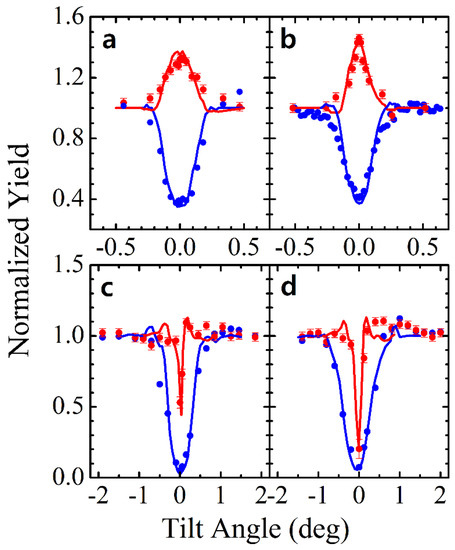 RBS/C dips obtained for the (0001) plane in (a) congruent and (b) near-stoichiometric LiNbO3, as well as for the axis in (c) congruent and (d) near-stoichiometric LiNbO3. The Li data are plotted as red circles and were obtained using NRA via the 7Li(p,α)4He reaction and the Nb data are plotted as blue circles and were obtained using Rutherford Backscattering. The uncertainty bars for Nb-RBS are smaller than symbols. Adapted from Kling et al. [59,61].