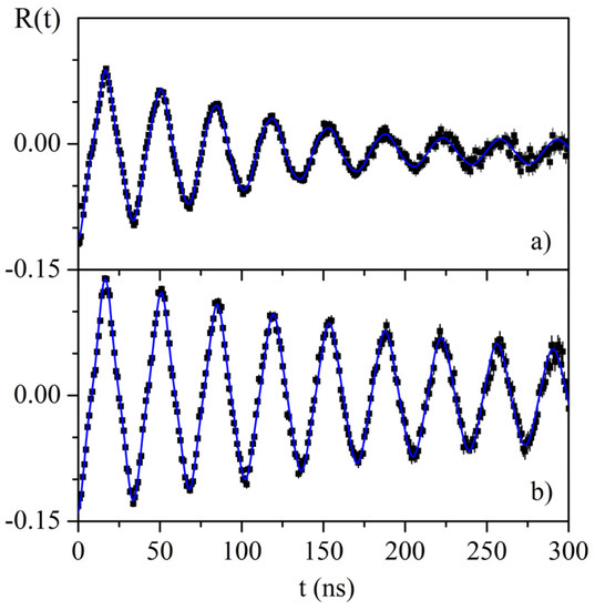 Perturbed Angular Correlation spectra obtained (a) in a congruent LN crystal, and (b) a near-stoichiometric LN crystal grown with 4.6 wt % K2O in the melt. Drawn using data from references [53,63].
