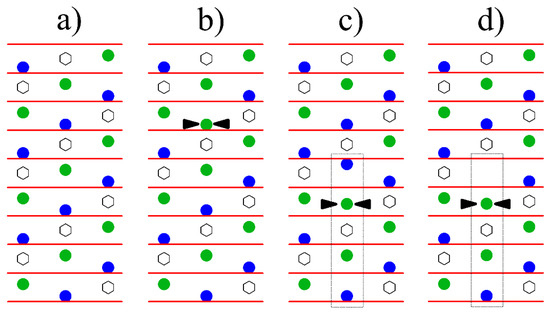 Stacking models for LiNbO3: (a) regular stacking, (b) Nb-antisites (extra Nb indicated by arrows), (c) ilmenite stacking faults (boxed area) and (d) like (c) but with Li vacancy (“complex defect”). Nb is represented by green, Li by blue and free octahedral positions by white symbols and the oxygen layers are depicted as red lines.