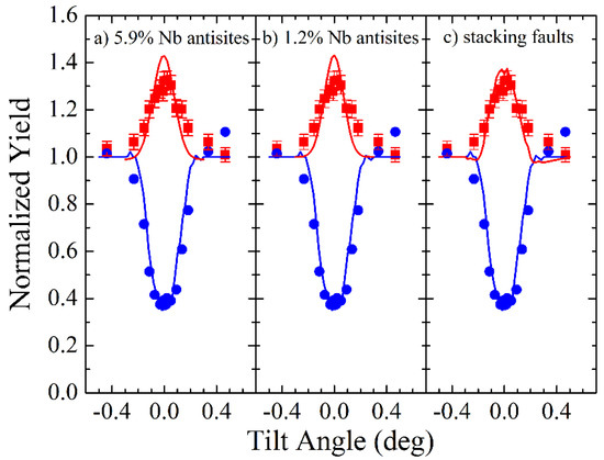 Comparison of experimental results and Monte Carlo simulations for the (0001) Li-NRA angular scan assuming different defect models for congruent lithium niobate: (a) 5.9% niobium antisites, (b) 1.2% niobium antisites, and (c) 2% ilmenite type stacking faults. The Li data are plotted as red circles and were obtained using NRA via the 7Li(p,α)4He reaction and the Nb data are plotted as blue circles and were obtained using Rutherford Backscattering. The uncertainty bars for Nb-RBS are smaller than symbols. Redrawn from Kling et al. [61].