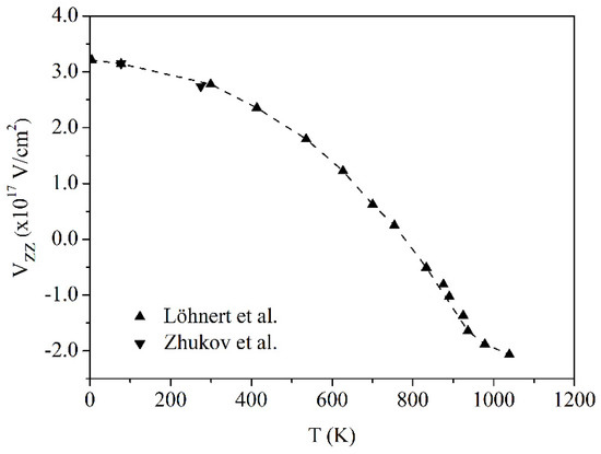 There are few measurements of the temperature dependence of the nuclear quadrupole interaction at the Nb/Ta site in LN and LT. Schempp et al. [41] reported 181Ta NQR measurements in polycrystalline near-stoichiometric LN in a reduced temperature range from 21 to 515 K, where a continuous decrease of the EFG was observed. Moreover, the linewidths of the signal from near-stoichiometric samples were markedly narrower than the ones from Li-deficient material and became narrower with the increase in temperature. Figure 17 plots 181Ta NQR and 181Ta ME results in polycrystalline LT reported by Zhukov et al. [89] and by Löhnert et al. [90], respectively. The variation of the EFG derived from the NQR and ME measurements shows a continuous decrease with temperature in an extended temperature range which includes TC. This variation can be essentially reproduced using the point-charge model of De Wette et al. [91], taking into account thermal lattice expansion and atom displacement [90], using data from Abrahams et al. [83]. As thermal lattice expansion alone would make the EFG increase moderately with temperature, the main contribution to the EFG comes from the displacement of the atoms. More advanced ab initio cluster calculations of Shelyapina et al. [92] reproduced the essential features of the EFG temperature dependence up to TC.