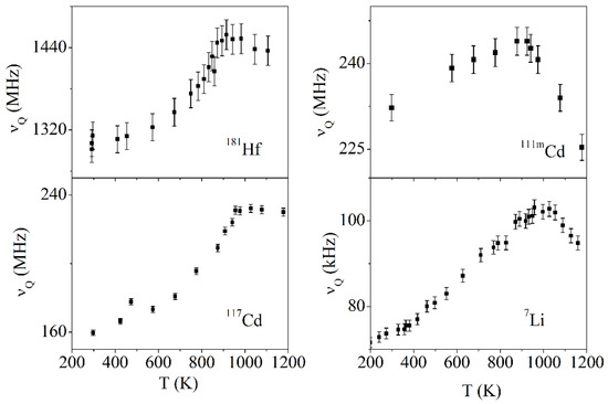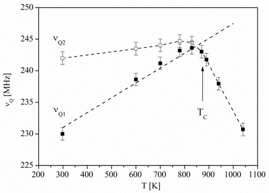 The temperature dependence of the QIF doublet reported by Marques et al. [97] is shown in Figure 19. The temperature dependence of νQ1 is close to the observed with 7Li in LT [93], as expected since the 111In probe atoms replace Li. The same is applicable for the 181Hf, 117Cd and 111mCd probes which also replace Li. In contrast, νQ2 that is associated to probes in Li-II sites, shows only a very weak temperature dependence. Close to and above TC, the derived νQ1 and νQ2 values are no longer distinguishable. This suggests that the differences between the Li-I and Li-II sites vanish in the high-temperature paraelectric phase.
