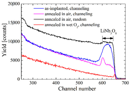 - Huang, Q.; Liu, P.; Liu, T.; Guo, S.-S.; Zhang, L.; Wang, X.-L. Lattice damage and waveguide properties of a proton-exchanged LiNbO3 crystal after oxygen-ion implantation. Nucl. Instr. Meth. B 2012, 286, 318–321. [Google Scholar] [CrossRef]