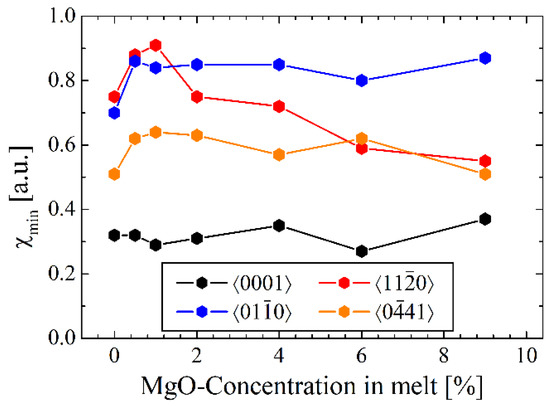 Measurements with congruent and near-stoichiometric LN, grown with 4.6 wt % K2O in the melt ([Li]/[Nb] = 0.979 [59]), reported by Kling et al. [60,61] showed contrary effects. NRA/C using the 7Li(p,α)4He nuclear reaction and RBS/C scans were performed simultaneously in order to study differences in Li- and Nb-sublattice between the two crystals. Several crystallographic axes and planes were investigated, as shown in Figure 9. The Li-NRA data corresponding to the (0001) plane, perpendicular to the c-axis, were particularly interesting. They showed a prominent flux peak that is considerably broadened in the congruent crystal in comparison to the near-stoichiometric one. The NRA-Li broadening suggests either a disordered Li sublattice or several well-defined defect sites for the Li ions. For the -axis, in which Li is located in the center of the channel, the minimum yield for Li-NRA/C drops drastically ruling out the possibility of simple NbLi antisites, i.e., the Li- and the Nb-vacancy model [60] Besides the stronger reduction of the 7Li(p,α)4He reaction yield at the surface the spectra for the stoichiometric extend also to higher depth indicating a reduced stopping power due to a diminished number of lattice defects in the channel compared to congruent material [61].