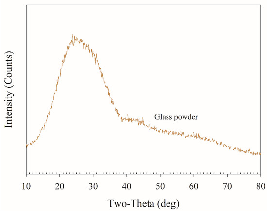 After the selection and transport of waste glass containers from a recycling plant to a laboratory, various steps must be performed before they could be used as raw material for geopolymer fabrication. First, the glass bottles were cleaned and dried in air. Next, the bottles were crushed to a particle size of less than 300 μm and then ground into powder by using a pan mill. The physical and chemical properties of the glass powder are presented in Table 1. The X-ray diffraction (XRD) patterns of the glass powder (Figure 1), which were obtained at a scanning rate of 2θ/min and over a scanning range of 10°–80°, revealed highly amorphous characteristics. The physical properties, chemical properties, and XRD patterns of the glass powder indicate that it had a high content of reactive silica, one of the most crucial substances to geopolymer formation. In short, glass powder was successfully used to replace sodium silicate in geopolymer preparation.