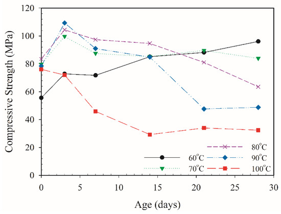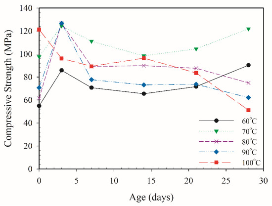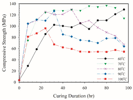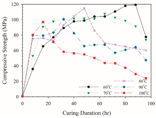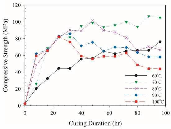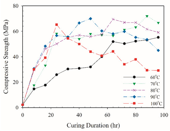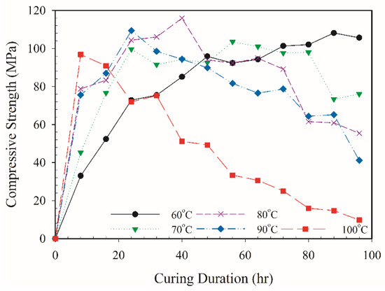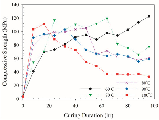 Figure 5, Figure 6 and Figure 7 present the variations with curing duration in the compressive strength of the geopolymer specimens at various curing temperatures when the optimal AE% of 3% was exceeded. For a curing duration of 24 h, the compressive strengths of the specimens with AE% of 4%, 5%, and 6% increased from 73.16 to 94.09 MPa, 77.19 to 83.28 MPa, and 72.84 to 109.37 MPa, respectively, under increases in the curing temperature from 60 °C to 90 °C. However, when the curing temperature increased to 100 °C, the compressive strengths of the specimens with AE% of 4%, 5%, and 6% decreased to 88.64, 71.13, and 71.98 MPa, respectively. When the curing duration was increased to 48 h, the compressive strengths of the specimens with AE% of 5% and 6% increased with the curing temperature between 60 °C and 80 °C but decreased with the curing temperature between 80 °C and 100 °C. For example, when AE% = 5%, the compressive strength increased from 98.80 to 114.84 MPa between 60 °C and 80 °C and then decreased to 55.02 MPa at 100 °C. By contrast, when AE% = 6%, the compressive strength remained relatively constant between 60 °C and 80 °C, with com-pressive strengths of 95.82, 92.59, and 94.03 MPa at curing temperatures of 60 °C, 70 °C, and 80 °C, respectively. When the curing temperature increased to 100 °C, the compressive strength decreased to 49.27 MPa.