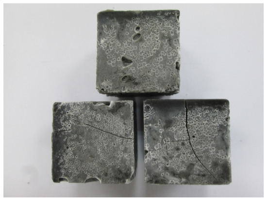 First, sodium hydroxide was mixed thoroughly with water; then, the alkali solution was cooled to room temperature. Next, a bath tank was heated to the preset aging temperature by using a temperature-controlled heating device, and the glass powder and alkali-activator mixture were poured into a sequencing batch reactor, after which they were combined by using a direct current (DC) mixer at 500 rpm for 30 s at room temperature. The mixture was then covered with plastic wrap and placed in a water bath to maintain its temperature. Mixing was continued at 500 rpm with the DC mixer until the preset time, after which the mixture was poured into 3 cm × 3 cm × 3 cm three-gang cube molds in two layers. The mixtures were tamped at a frequency of 60 Hz by using a vibration table (Italy CONTROLS) to eliminate the bubbles within the specimens. The following aging times were adopted for AE% of 1–6% below the aging temperature of 70 °C: 105, 55, 40, 35, and 25 min [32].
