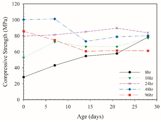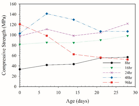 As mentioned in Section 3.2, an increase in the curing temperature can shorten the curing duration. Strength development in the specimens was investigated—specifically, that in those with AE% of 3% and 6% as they were maintained in air for 28 days after constant 24-h curing and curing over 8, 16, 24, 48, and 96 h.