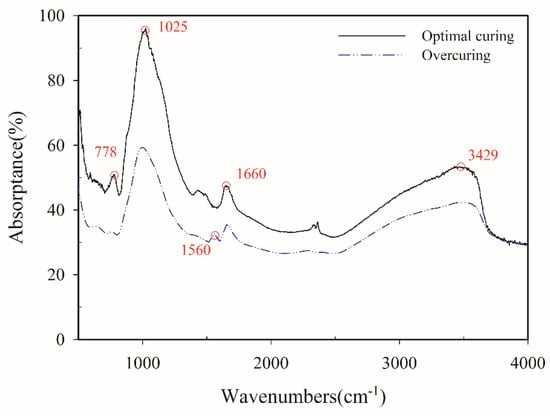 Figure 11 and Figure 12 illustrate the strength development of the specimens that were maintained in air after curing over varying durations. Among the specimens with AE% = 3%, the specimen cured for 24 h exhibited the highest compressive strength of 121.93 MPa after standing in air for 28 days. The specimen cured for 96 h exhibited the highest compressive strength of 120.75 MPa immediately after curing. Among the specimens with AE% = 6%, the specimen cured at 70 °C for 48 h exhibited the highest compressive strength of 100.37 MPa immediately after curing. The specimen cured for 24 h exhibited the highest compressive strength of 83.93 MPa after standing in air for 28 days. These results indicate that the optimal curing duration must be adopted for a glass slurry to dehydrate into a glass-based geopolymer. Excessive thermal energy damages glass microstructures in the long term. The Fourier transform infrared (FTIR) spectroscopy results of the specimens under optimal curing and overcuring conditions are presented in Figure 13. The peak at the wavenumber of 1560 cm−1 in the FTIR spectrum of the specimen subjected to overcuring is attributed to the presence of sodium carbonate [36]. No peak was observed in the FTIR spectrum of the geopolymer cured for the optimal duration.