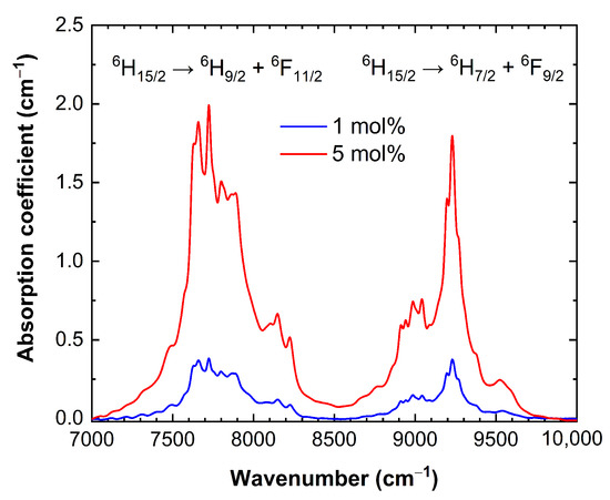 To characterize the incorporation of dysprosium impurity into the host, the absorbances of LYB crystals doped with Dy3+ ions in concentrations of 1 and 5 mol% were compared using samples of identical thickness and orientation. The absorption bands in the 7000–10,000 cm−1 wavenumber range corresponding to the electronic transitions from the 6H15/2 ground state to the 6H9/2, 6F11/2, 6H7/2, and 6F9/2 terms of the excited state can be seen in Figure 2. The amplitude of the absorption bands measured in the LYB:Dy(5 mol%) crystal was by a factor of five higher than that in LYB:Dy(1 mol%). This confirms that the distribution coefficient of Dy3+ ions is the same in both cases and does not depend on the Dy concentration in the melt (see also [15]).
