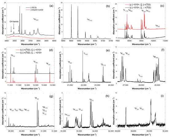 To determine the fine structure of Dy3+ electronic transitions, detailed high-resolution measurements were performed at a low temperature. The absorption spectra of LYB:Dy (5 mol%) crystal in the 3000–40,000 cm−1 wavenumber range present a sequence of narrow bands with a minimum halfwidth of about 1 cm−1 at T = 8 K. The absorption bands correspond to the transitions from the lowest sublevel of the 6H15/2 ground state to the excited energy levels of the Dy3+ ions, which can be easily assigned using the Dieke diagram [28] up to the 4F7/2 multiplet at about 25,000 cm−1. Because of the monoclinic crystal structure of LYB, all energy levels of Dy3+ split into the maximum possible number of Stark components separated by about 100–600 cm−1. As a consequence, the Stark components of various nearby levels are mixed and cannot be unambiguously assigned, especially at high energies above 29,000 cm−1 (see, e.g., Figure 3g,h). Some doubtful assignments based on the excitation spectrum of a LYB:Dy crystal can be found in the paper by Saha et al. [24]. Difficulties in the determination of the proper energy terms have also been encountered for other monoclinic crystals, such as KY(WO4)2 and Lu2SiO5, doped with Dy3+ ions [29,30]. Most of the spectral lines experimentally observed in LYB:Dy in the present work are shown in Figure 3 and the most probable assignments are listed in Table 1. Beside the electronic transitions of Dy3+ ions some additional weak absorption bands attributed to the stretching vibration of hydroxyl ion (OH−) impurities can be observed between 3450–3560 cm−1 as shown in Figure 3a. According to our measurements, these bands are present in undoped and other RE ion doped LYB crystals as well. The uneven baseline in this wavenumber range is related to the absorption of higher harmonics of the B-O vibrations in the host crystal.