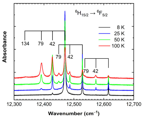 It is remarkable that upon gradually increasing the temperature from 8 to 100 K, additional lines appear in the absorption spectrum, which can be related to the transitions from thermally populated higher states of the 6H15/2 ground state of Dy3+ to various terms of the excited state. Figure 4 demonstrates this on the example of the 6H15/2 → 6F5/2 transition. At the lowest temperatures nearly exclusively the lines at 12,470, 12,528.4, and 12,605.5 cm−1, corresponding to transitions from the lowermost Stark level of the 6H15/2 ground state, are seen. As the higher sublevels of the ground state become populated at elevated temperatures, additional repetitions for these transitions appear at wavenumbers less by the same amounts (42, 79, and 134 cm−1) corresponding to transitions from some of the higher Stark levels of the ground state to unchanged excited states. The positions of these hot replicas are helpful for identifying the lowest energy Stark levels of the ground state to be situated at 42, 79, and 134 cm−1. The higher energy crystal field components of the ground state were determined from luminescence measurements (see below).