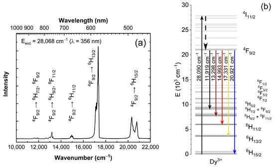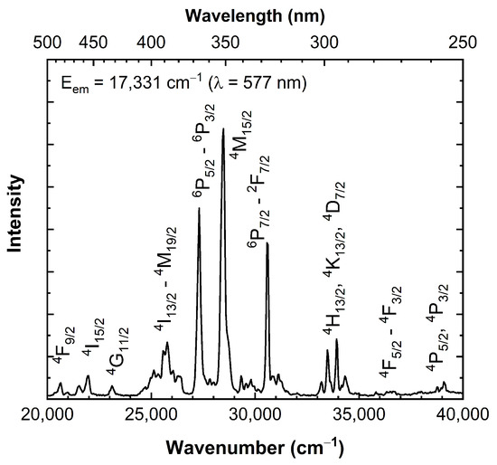 The position of higher energy multiplets of the Dy3+ ion in Li6Y(BO3)3 may be obtained from the excitation spectra of the LYB:Dy(1 mol%) single crystal measured for the 17,331 cm−1 emission line, one of the most intense ones in the series of the 4F9/2 → 6H13/2 transitions (Figure 8). The general features of the recorded excitation spectrum are in good agreement with the excitation spectra reported earlier for glass [12] and crystalline material [24], however, by using a better spectral resolution it was possible to ascribe the observed bands to specific levels of the higher-energy multiplets situated above 22,000 cm−1.