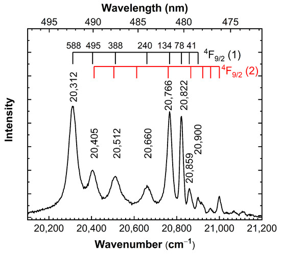 The shape of the bands responsible for the 4F9/2 → 6H15/2 and 4F9/2 → 6H13/2 transitions varies in the above-cited works, and for that reason, zoomed spectrum parts measured with higher spectral resolution are shown for these transitions in more detail in Figure 6 and Figure 7. The fine structure of these transitions is represented by 8 lines in the regions of 20,200–20,950 cm−1 (Figure 6) and 7 lines in the region of 17,000–17,350 cm−1 (Figure 7), respectively, in agreement with the number of crystal field components of the given multiplets 6H15/2 and 6H13/2. Weaker lines at higher wavenumber values in both Figure 6 and Figure 7 are due to transitions from a hot state of the 4F9/2 multiplet. The Stark components of the 6H15/2 ground state can be determined from the 4F9/2 → 6H15/2 luminescence spectrum (see black scale (1) on top of Figure 6). The three lowest energy levels are in good agreement with those obtained from the hot bands in the absorption spectra measured at about T = 100 K (see, e.g., Figure 4). A few lines at wavenumber values higher than 20,900 cm−1 may be related to the hot transitions originating from the second Stark component of the 4F9/2 multiplet populated at 78 K (see red scale (2) on top of Figure 6).