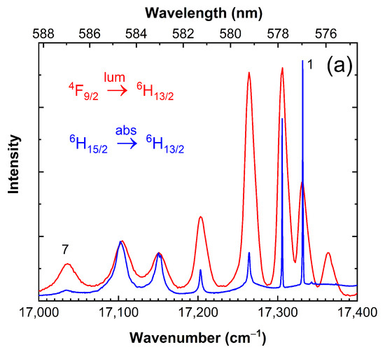 The Stark components of the 6H13/2 multiplet can be determined from both the absorption and luminescence measurements. It is remarkable, that the detailed structure of the 4F9/2 → 6H13/2 emission corresponds almost perfectly to the reversed absorption spectrum shown for the 6H15/2 → 6H13/2 transition at 8 K in Figure 3a. The reversion point was defined by the overlay of the emission line at 17,331 cm−1 with the absorption line at 3564.7 cm−1. This comparison demonstrates the consistency of the results obtained by the two spectroscopic methods.