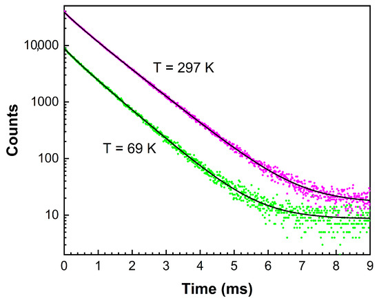 Decay curve of the emission at 17,331 cm−1 under excitation at 28,382 cm−1 at 69 and 297 K. Solid black curves present the results of curve fitting with two decay components listed in the text.