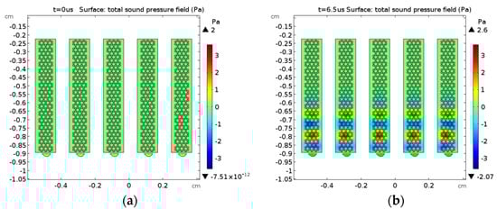 As shown in Figure 4, the sound pressure diagrams of the ultrasonic signals at different moments were recorded. Among them, the frequency of the sound signal was 100 kHz, and the red and blue in the sound pressure diagrams represent the sound wave signals in opposite directions. The darker the color, the greater the sound pressure value and the higher the energy. When t is 0 μs, there is no sound pressure distribution inside the sound channel, and it is all green. With the increase in time, the sound wave signal is gradually transmitted along the sound channel under the action of parallel excitation. When t is 6.5 μs, the sound wave is transmitted to the 1/3 channel. Similarly, when t is 11.5 μs, the sound wave is transmitted to the 2/3 channel. The acoustic signal is transmitted from the incident port to the CMUT receiving end. Additionally, the energy is concentrated inside the model without spreading to the surroundings and gradually becomes stable after 18.25 μs. In addition, during the transmission of the sound wave signal, the red and blue sound fields alternately appear, i.e., the same direction sound waves and the opposite sound waves alternately appear. This is because different metamaterial layers emit sound waves at different positions, and the phase of the sound waves emitted depends on the position of the acoustic metamaterial array. When its position is an even multiple of the half-wavelength, an in-phase acoustic wave is generated; when its position is an odd multiple of the half-wavelength, an anti-phase acoustic wave is generated. It can be seen from the sound pressure diagram that the energy value in the sound channel is much greater than the sound pressure value of the pressure source, indicating that the sound channel has a good local enhancement effect. The detection signal of minimally diseased tissue is amplified, which reduces the difficulty of detection. At the same time, the breast ultrasound signal is transmitted directionally along the acoustic channel and reaches the receiving end of the CMUT transducer without spreading to the surroundings. The collection speed of breast volume data was increased to achieve fast, real-time, high-resolution imaging.
