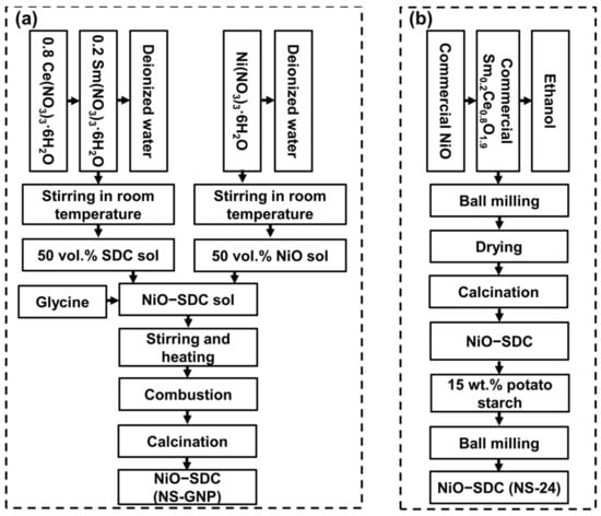 The NiO–SDC composite anode powder was prepared via the glycine–nitrate combustion process (GNP), using hydrated metal salts (purchased from Merck Chemicals, Germany) Sm(NO3)3 6H2O (99.9%), Ce(NO3)3 6H2O (99%), and Ni(NO3)2 6H2O (99%) as cation precursors, and glycine (Friendemann Schmidt Chemicals, Germany) as fuel. All metal salts were dissolved separately with a minimum addition of deionized water. The dissolved metal salts were combined according to the molar ratio to form the desired Sm0.2Ce0.8O1.9 (SDC) mixtures in the final powders, ensuring that the NiO volume content in the final composites was 50%. Glycine (Friendemann Schmidt Chemicals, Germany) was added with the molar ratio of glycine to total metal cations of 2. The solution was evaporated at 80 °C to form gel and then burned to form black ashes. The resulting ash was collected and calcined at 900 °C for 5 h to obtain NiO–SDC composite anode powder. The prepared NiO–SDC composite anode powder was classified as NS-GNP. For comparison, the NiO–SDC composite anode powder was prepared via ball milling process at a weight ratio of 6:4. The NiO powders with average particle size of 50 nm and (Sm0.2Ce0.8O1.9) SDC powders with average particle size of 500 nm were used as raw materials. All the raw materials were purchased from Sigma Aldrich, Malaysia. NiO and SDC powders were mixed together with ethanol and ball milled for 24 h. The mixed powder was then dried in an oven at 120 °C for 12 h and calcined at 700 °C for 2 h to obtain the desired NiO–SDC composite anode powder. The prepared NiO–SDC composite anode powder was classified as NS-24. The NS-24 composite anode powder was ball milled with 15 wt.% potato starch to improve its sinterability and porosity. A flow chart of the prepared NiO–SDC composite anode powder is shown in Figure 1.