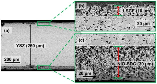 For the single-cell performance test, a YSZ electrolyte-supported single cell was fabricated by screen-printing NiO–SDC composite anode ink on the electrolyte, followed by sintering at 1300 °C for 4 h. LSCF cathode ink was also screen-printed on the other side of the electrolyte, followed by sintering at 1100 °C for 2 h. The area of the cathode was 1 cm2. The structure of the SOFC single cell was LSCF/YSZ/NiO–SDC (Figure 2). The total thickness of the YSZ electrolyte-supported single cell was approximately 300 µm, consisting of 260 µm YSZ substrate, 10 μm LSCF, and 30 μm NiO–SDC layers.