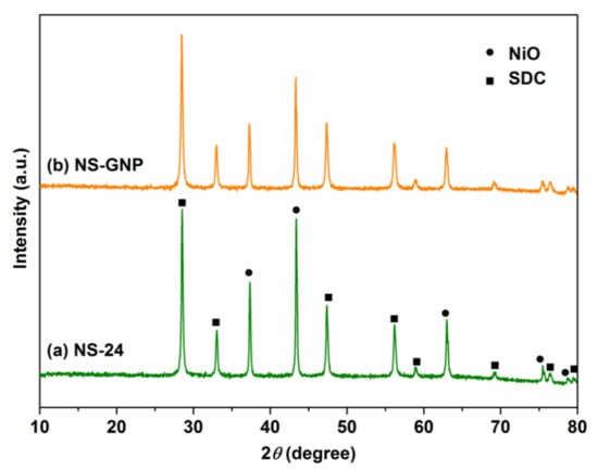 The phase of the prepared NiO–SDC composite anode powders was identified through XRD. The phase analysis data for NS-GNP and NS-24 are shown in Figure 3. In both cases, the XRD results confirmed that no phase changes or any chemical reaction occurred between NiO and SDC during synthesis and calcination. No additional or secondary peaks as impurities were observed for the prepared composite anode powders, thereby demonstrating excellent chemical compatibility after mixing and calcination. The two main phase structures of single-crystalline cubic NiO (JCPDS No: 47-1049) and face-centered cubic fluorite SDC (JCPSD No: 34-0394) were identified. The theoretical densities (ρthd) of NS-GNP and NS-24 were 6.84 and 6.85 g/cm3, respectively. These values were comparable to those reported in the literature []. The theoretical density was nearly identical, regardless of the synthesis technique used.