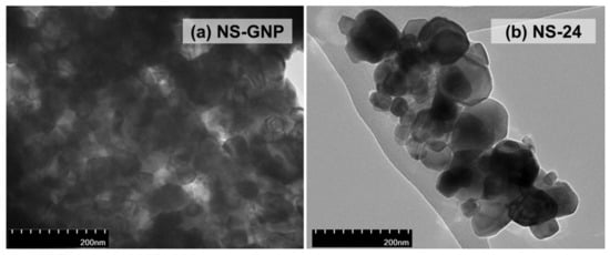 The TEM images at 5000× magnification for NS-GNP and NS-24 composite anode powders are shown in Figure 4. The TEM micrograph shows a foam-like morphology with uniformly distributed macro-sized particles with NiO and SDC for NS-GNP (Figure 4a). This foam-like microstructure exhibits low filled density due to the large number of voids inside, significantly improving the mass transportation []. The particles are bound together into agglomerates for NS-GNP because of the decomposition of nitrates and burning of a combustion agent that releases large amounts of gasses (Figure 4a). However, the primary particles of NiO and SDC do not agglomerate together to form large secondary particles. For NS-24, TEM analysis exhibited uniformly distributed small spherical particles, in addition to macro-sized non-spherical particles. The large non-spherical particles in the NS-24 sample could be attributed to the NiO particles and the small spherical particles are SDC particles. A similar observation was also reported in the synthesis of NiO–SDC with the NiO content of 60 wt.% []. In addition, homogenously distributed SDC particles act as an inhibitor and restrict the grain growth of NiO particles in the NS-GNP sample. Thus, it can be concluded that the macro-sized non-spherical sized particles are NiO particles in the NS-24 sample.