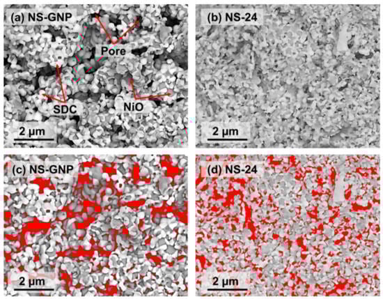 The connectivity between the white region and gray region is continuous, suggesting the existence of well-connected grains of Ni–Ni and SDC–SDC in the NS–GNP cermet (Figure 5a). The grain-to-grain contact is regarded as having greater importance to facilitate better oxidation of H2 from the Ni contact and mechanical support for Ni from SDC contact. In addition, grain continuity contributes to the length of the triple phase boundary (TPB) and increases the efficiency of the Ni–SDC cermet anode. As shown in Figure 5b, the microstructure of NS-24 exhibits Ni-rich clusters of larger grains (gray) found with smaller SDC grains (white), thereby contributing to degradation in anode performance efficiency. FESEM images of Ni-SDC cermet anode pellets were processed using an image analysis technique developed using the public domain software “ImageJ” to estimate NS-GNP and NS-24 porosities. Figure 5c,d represents the treated FESEM image obtained with the image analysis procedure for quantifying the percentage of porosity. The porosity is depicted in red, the Ni particles in gray, and the SDC particles in white. The pore distribution was uniform with a large number of open pores as evident in NS-GNP. Figure 5d confirms that NS-24 exhibited a slightly denser microstructure than NS-GNP. This result is due to a difference in the grain size distribution and formation of large Ni and SDC particles in the microstructure.
