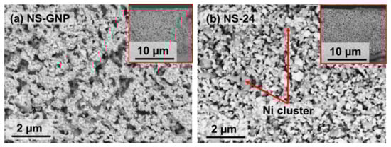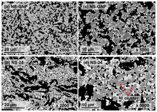 The cross-sectional images of NS-GNP and NS-24 (with pore former) after ion-milling at low (×2000) and high (×5000) magnifications are shown in Figure 6. Ion-milling of Ni-SDC cermet anode has revealed more knowledge about the phase distribution of Ni and SDC grains, grain size, and porosity. In the highly magnified images of NS-24 (Figure 6d), the formation of large Ni and SDC clusters and macro-sized non-spherical sized Ni particles are clearly evident. This finding agrees with the TEM image analysis of the NiO-SDC composite anode powder produced by ball-milling techniques. Figure 6c shows that large Ni particles (gray) are uniformly covered with smaller SDC (white) to form a continuous path. This microstructural feature of the NS-GNP can facilitate a rapid exchange reaction between hydrogen gas and oxide ions by extending the length of the triple-phase boundary associated with phase connectivity [].
