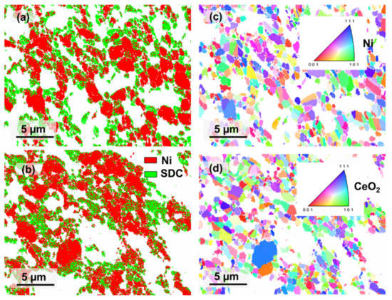 EBSD phase map and 2D inverse pole figure (IPF) of the reduced Ni–SDC cermet anode: (a,c) NS-GNP and (b,d) NS-24 cermet anode; reference triangles of each IPF map (insert).