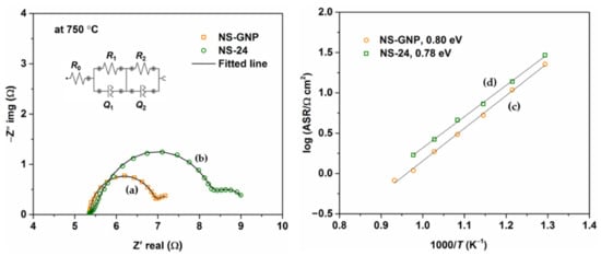 Impedance spectra of (a) NS-GNP and (b) NS-24 measured at 750 °C and an equivalent circuit used to fit in the impedance circuit (inset); Arrhenius plots of the ASR values of the (c) NS-GNP and (d) NS-24.