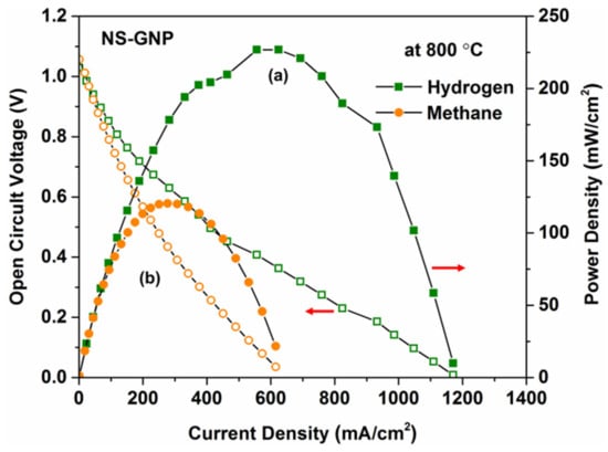 The cross-section microstructure of a single cell with the configuration of NS-GNP|YSZ|LSCF is shown in Figure 2a,c. The NS-GNP anode layer is approximately 30 μm thick and adheres well to the YSZ electrolyte substrate, and the thickness of the porous LSCF cathode layer is approximately 10 μm. The YSZ electrolyte substrate is approximately 260 μm thick. The FESEM images demonstrated that the anode microstructure is porous and the well-connected pores are evident. To evaluate the electrochemical performance of NS-GNP cermet anode, the electrolyte-supported cells were tested using humidified H2 and CH4 as the fuel and air as the oxidant at intermediate temperature of 600 °C–800 °C. The cell voltages (V) and the corresponding power densities (P) as the function of current density (I) were measured at 800 °C (Figure 11). The open circuit voltage (OCV) decreased as the operating increased from 600 to 800 °C for both H2 and CH4 fuels. This can be attributed to a trace of gas leakage through the electrolyte or cell []. However, the overall OCV value for the cell under H2 and CH4 are close or even higher than the reported values (Table 3). This finding suggests that the YSZ electrolyte does not experience mixed electronic and ion conduction under reducing atmosphere and prevents any internal loss of performance. Therefore, the OCVs of the SOFC with YSZ electrolyte are usually superior to those of SDC electrolyte-supported SOFCs.